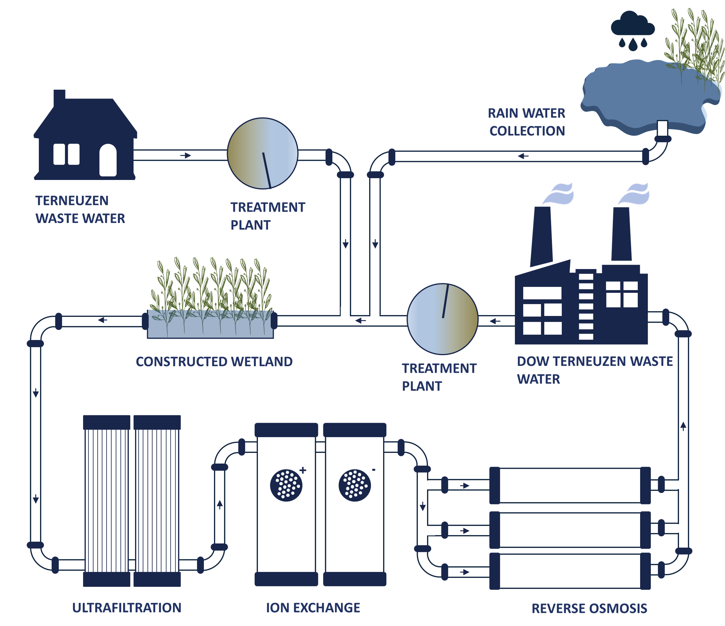 In the Demin2030 project, research is conducted into demineralized water production of the future, with the aim of applying the researched concepts within 5- to 10 years. Among other things, the situation of Dow Terneuzen is being examined. By using a higher water quality, water use becomes more efficient because it is easier to reuse and wastewater is limited.